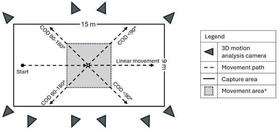Schematic representation of the data collection setup. Distance of the 3D motion analysis camera to the capture area was 3 m. Movement area was in the middle of the capture area and was 4 × 4 m. The start spot was 0.5 m inside the capture area boundary. * Area where the changes in pace (accelerating/decelerating intensities), changes of direction (COD), jump, and stop of motion were performed.