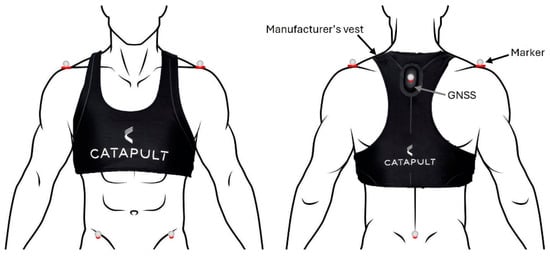 Schematic of the locations of the GNSS device and retro-reflective markers attached to the participant.