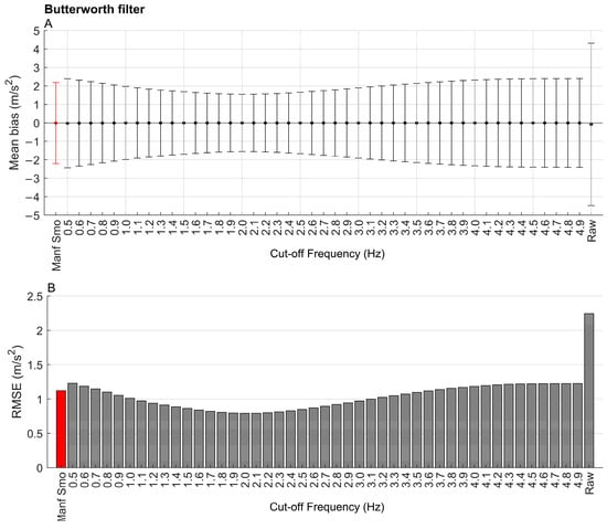 Measurement indices of validity indicating how closely the GNSS acceleration data resemble the Vicon acceleration data using a Butterworth filter with different cut-off frequencies. (A) Mean bias with 95% LoA for the difference between GNSS acceleration minus Vicon acceleration. (B) Precision/RMSE for the difference between GNSS acceleration minus Vicon acceleration. Manf Smo = manufacturer smoothed acceleration data. Raw = not smoothed in any way by the manufacturer software.