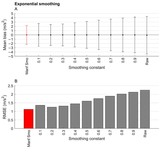 Measurement indices of validity indicating how closely the GNSS acceleration data resembled the Vicon acceleration data using exponential smoothing with different smoothing constants. (A) Mean bias with 95% LoA for the difference between GNSS acceleration minus Vicon acceleration. (B) Precision/RMSE for the difference between GNSS acceleration minus Vicon acceleration. Manf Smo = manufacturer smoothed acceleration data. Raw = not smoothed in any way by the manufacturer software.