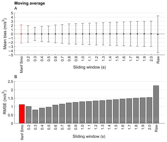 Measurement indices of validity indicating how closely the GNSS acceleration data resembled the Vicon acceleration data using the moving average smoothing over different sliding windows. (A) Mean bias with 95% LoA for the difference between GNSS acceleration minus Vicon acceleration. (B) Precision/RMSE for the difference between GNSS acceleration minus Vicon acceleration. Manf Smo = manufacturer smoothed acceleration data. Raw = not smoothed in any way by the manufacturer software.