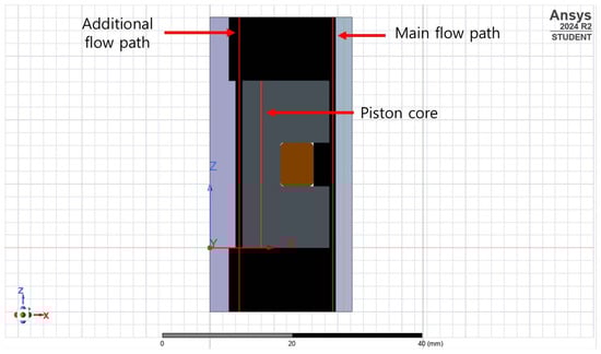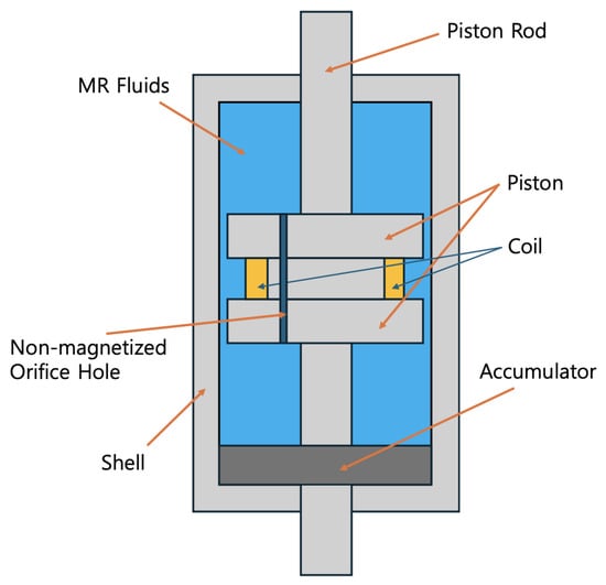 Figure 1 and Figure 2 show schematics of an MR damper with an additional flow path inside the piston that is not affected by magnetic fields. The piston separates the cylinder of the MR damper into the upper and lower chambers. The interior of the cylinder consists of an additional flow path inside the piston, a base gap, and a nitrogen accumulator. The nitrogen accumulator provides vibration absorption and stability to the damper through elastic force. The MR fluid in the inner chamber of the cylinder passes through an additional flow path and a basic gap when a magnetic field is not applied. The performance of MR dampers with an additional flow path in alleviating the shortcomings of existing MR dampers has been demonstrated, and the number of cases in which they are applied is increasing. Park et al. proposed an asymmetric MR damper with different damping forces in the tensile and compression directions by opening and closing additional flow paths []. Jeon et al. considered the sensitivity and purge control performance of an MR damper with an additional flow path [].