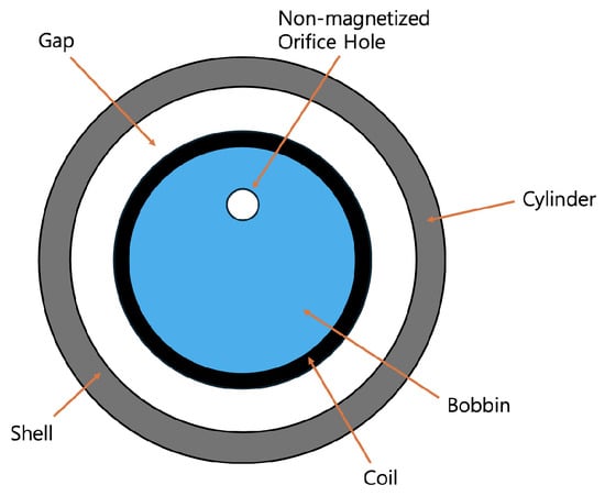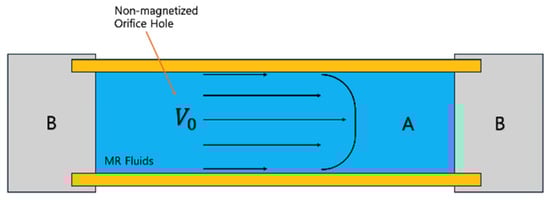 Additionally, the following theory is applied to to formulate it in the same manner as . In the proposed MR damper, the additional flow path can be interpreted as a fully developed laminar flow in a circular pipe covered by hydrodynamics. In the proposed additional flow-path-type MR damper, the flow in the non-magnetic orifice is shown in Figure 4. This can be interpreted as fully developed laminar flow within a circular pipe in fluid dynamics, which provides structural characteristics that may help alleviate the block-up phenomenon.