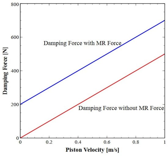 For the proposed MR damper with an additional flow path, the total damping force is shown in Figure 7. When the piston speed is high in this damper shape, the viscous damping force caused by the flow through the orifice is greater than the damping force of the basic MR damper with yield stress. The damper operates based on the smaller of the two damping forces, and this small value determines its overall damping force. This allows the damper system to balance the damping force to provide more stable damping performance (25). Accordingly, the total damping force of the proposed MR damper with an additional flow path, , is defined as follows: