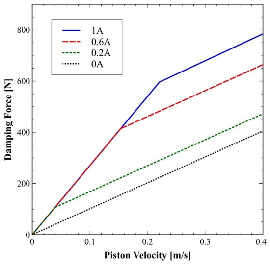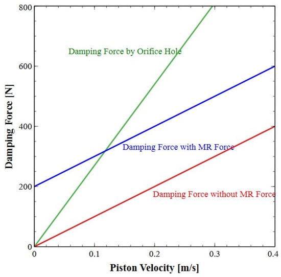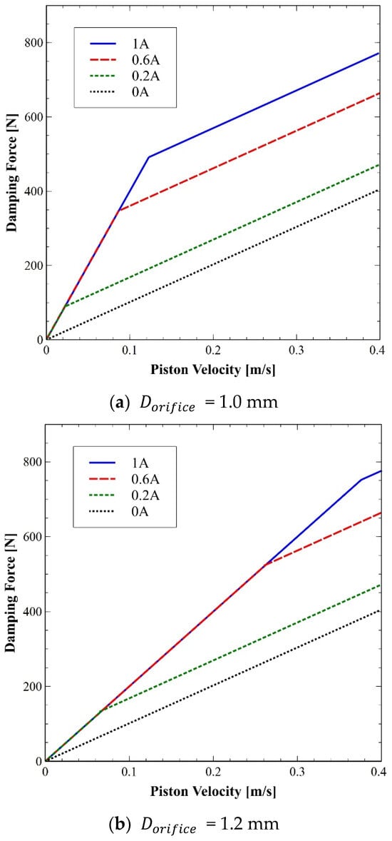 Based on the above calculations for the proposed MR damper with an additional flow path, an orifice hole is formed inside the coil such that the fluid flow is not affected when the MR fluid passes through the orifice. When a magnetic field is applied to these dampers, the fluid friction caused by the yield stress causes the MR fluid to flow through the orifice hole. Thus, when the piston speed is high, the viscous damping force generated by the orifice is greater than the damping force caused by the basic gap and MR fluid. This can be observed in Figure 6 and Figure 7.
