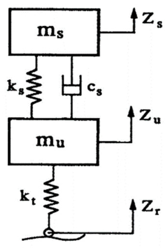 The equation of motion of the two-degree-of-freedom (2-DOF) suspension system shown in Figure 8 is expressed as a linear spring constant and a linear damping rate . The tire was modeled using the spring constant . The linear equation of motion is expressed as follows: