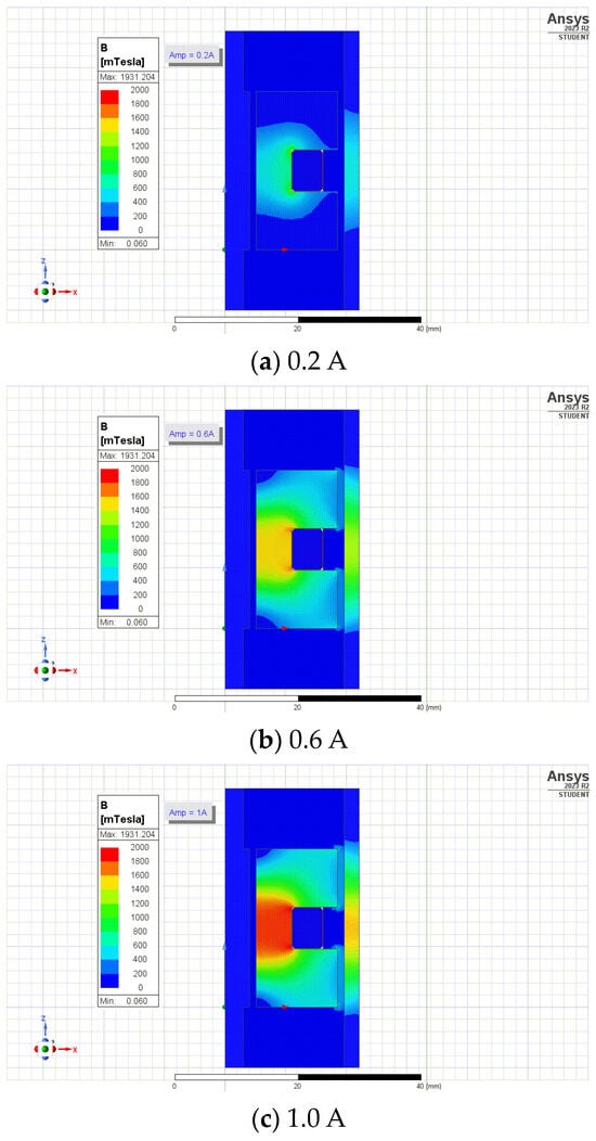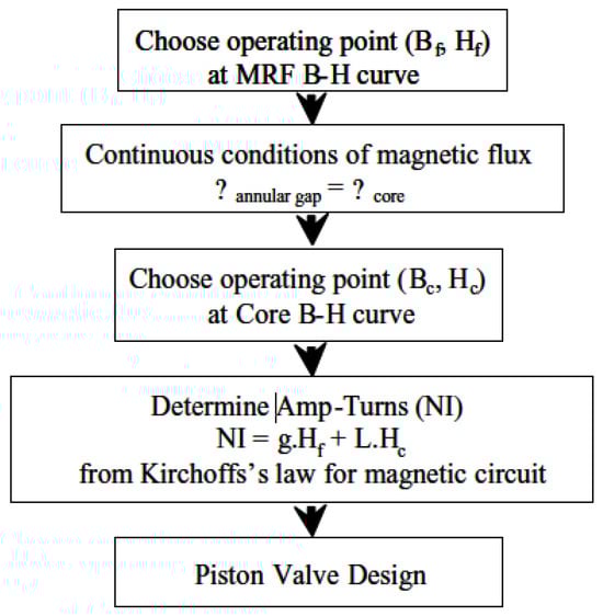 Based on this, the length of the piston rod that can be used in the magnetic circuit was determined, and an electromagnetic analysis was performed using ANSYS Maxwell software 2024 R3. The main variables of the electromagnetic analysis were the number of coil turns, current range, and the diameter and length of the main flow path, which were repeated until each operating point was located in the linear section of the B-H graph. Because the main flow path has a significant influence on both electromagnetic and flow analyses, and its design range is closely related to saturation of the magnetic circuit, the optimal value was selected through electromagnetic analysis prior to flow analysis. The above process is a modified design guide provided by the L Company and is shown in Figure 9; the manufacturer of the MR fluid and its effectiveness have already been proven.