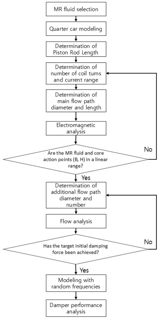 The MR damper has resolved the block-up phenomenon through the application of the additional flow path. Additionally, it was confirmed that the proposed MR damper has excellent performance in controlling the range of displacement, speed, and acceleration of the upper part of the vehicle at various vehicle speeds and sinusoidal road surface excitations. Future research will focus on validating the design method proposed in this study through the fabrication and testing of actual dampers, thereby enabling a more thorough evaluation of their performance in real-world applications. Additionally, further studies will be conducted on bump characteristics to analyze the response behavior under various driving conditions. Building upon these findings, the application of MR dampers to vehicle suspension systems is expected to enhance system performance and increase stability, leading to synergistic effects. These future research endeavors and their potential applications are anticipated to make a significant contribution to accelerating the practical implementation of MR damper technology.