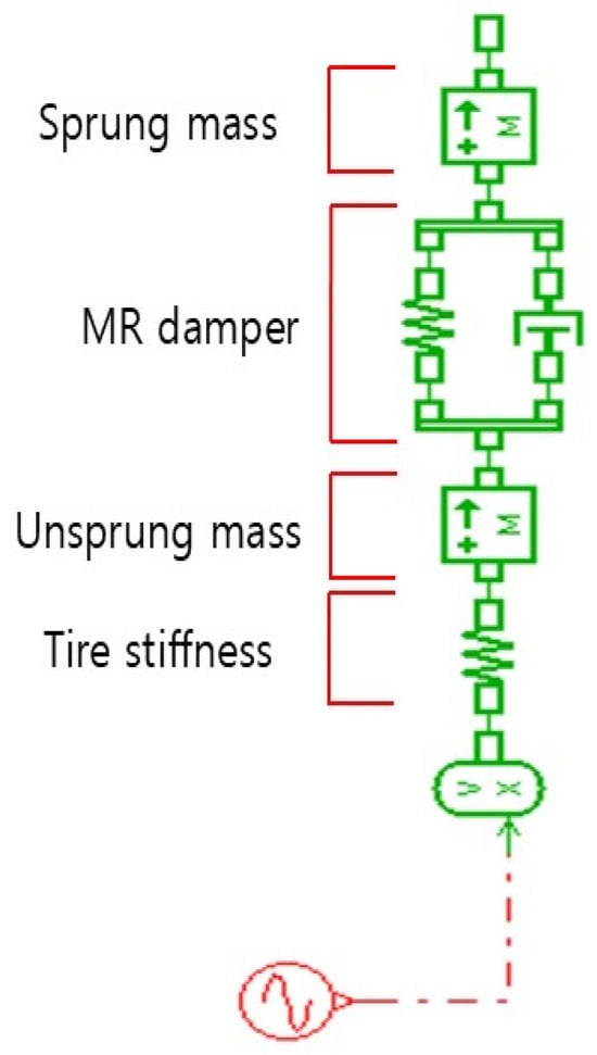 For vehicle modeling to be used in the performance analysis of an MR damper with an additional flow path, a linear suspension quarter car is modeled using AMESim based on Company M’s medium-sized vehicle data. This is illustrated in Figure 12. Because it is a quarter-car model, 317.5 kg (one-quarter of the total spring upper mass) was set as the sprung mass because the upper spring mass was distributed and transmitted to the four tires. The suspension spring, unsung mass, and tire spring coefficients used in this study are listed in Table 2.