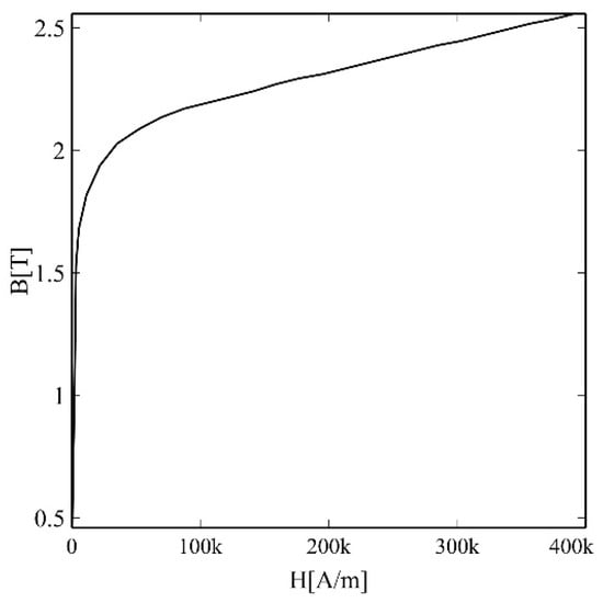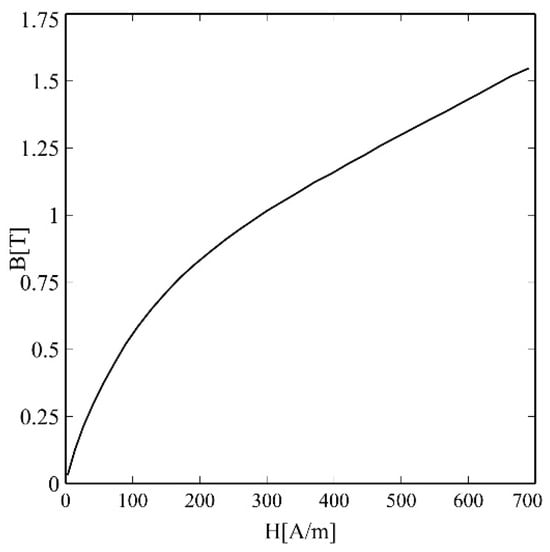 For these calculations, dampers containing MR fluids were modeled using ANSYS Maxwell 2D. In the electromagnetic analysis setting, the shape mode was cylindrical based on the Z-axis, the analysis mode was magneto-static, and the damper was located at the center of a vacuum sphere with a diameter of 1 m. The electromagnetic force generated by the solenoid core was modeled as the product of the number of coil windings and the current. The modeled MR damper was designed as a two-road type to eliminate deviations based on the accumulator and operating direction. The cylinder and piston rod used a non-magnetic material, AL6061, to prevent magnetic flux from flowing out of the magnetic circuit and to secure mechanical rigidity. In contrast, AISI 1008, a ferromagnetic material, was used as the core and flux ring corresponding to the magnetic circuit, and copper was used as the solenoid coil. The empty space inside the flow path and damper was input by extracting several action points from the B-H graph of the fluid provided by the manufacturer of MRF-132DG. The designed magnetic circuit and numerical values are shown in Table 3 and Figure 13, and the physical properties and B-H diagrams of the materials constituting the magnetic circuit are shown in Table 4 and Table 5 and Figure 14 and Figure 15, respectively.