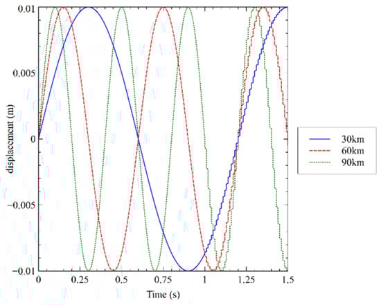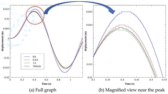 For a displacement of 90 km/h, when the added current was 0 A, 0.6 A, and 1 A, the maximum values were 0.00608 m, 0.00672 m, and 0.00708 m, and the time to reach them was 0.676 s, 0.6445 s, and 0.6335 s, respectively. For the test vehicle, the maximum values and reaching times were 0.00695 m and 0.638 s, respectively.