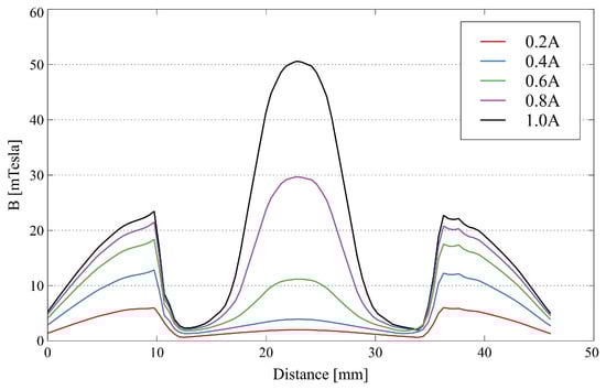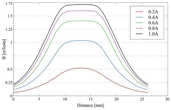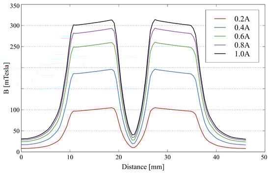 In Equation (18), the yield stress of the MR fluid is determined by the magnetic flux density B generated in the magnetic circuit of the MR damper. The magnetic flux density B is generated by the magnetic field that occurs when current flows in the solenoid coil according to Ampere’s law. The relationship is shown in Equation (19):