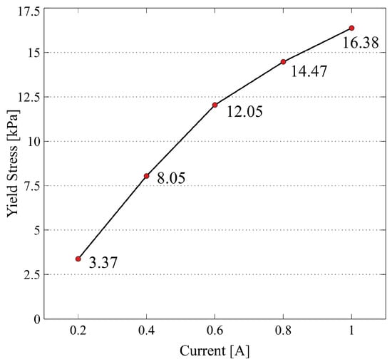 In Equation (17), is the length of the basic gap, is the width of the basic gap, C is the flow rate coefficient of the MR fluid, and is the yield stress of the MR fluid generated by the application of current which can be calculated using Equation (18):