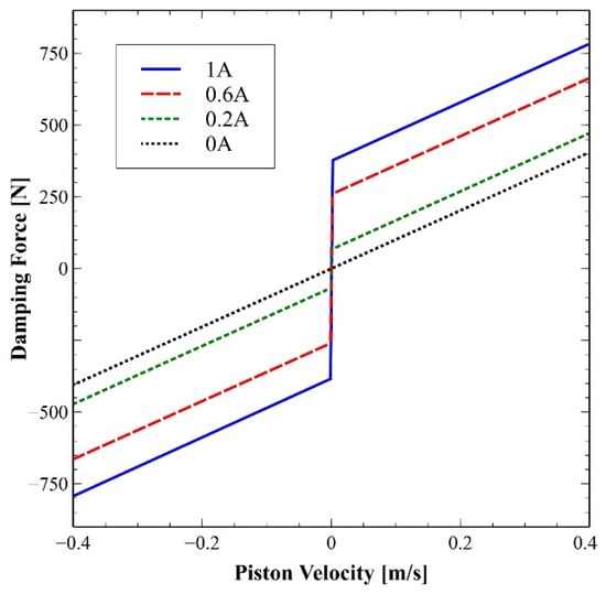 This confirms that Equation (4) can be expressed as Equation (20) for the MR damper with an additional flow path proposed in this study, and it was used to examine the total damping force based on the piston speed and applied current.