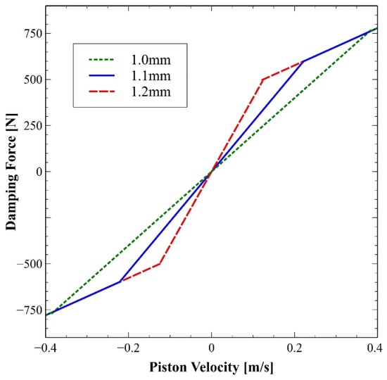 It was confirmed that when the diameter of the orifice is large, the damping force changes rapidly at low piston speeds, but it can produce a fast-damping effect, and when the diameter is small, the opposite effect can be produced, as shown in the Figure 26. Based on the results, the total damping force is compared when = 1.0 mm, = 1.2 mm, and = 1.1 mm, as shown in Figure 27. The comparison is based on an applied current of 1.0 A, which is the most severe change in the damping force and is a basic characteristic of the MR damper.