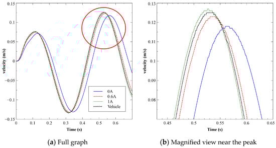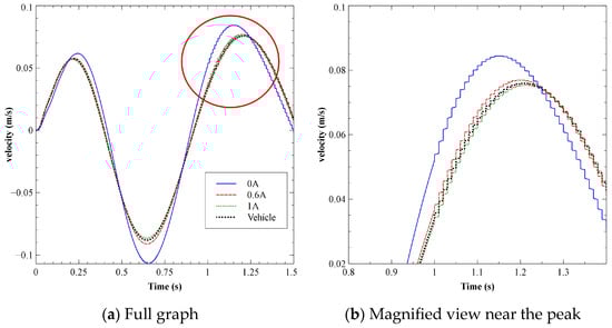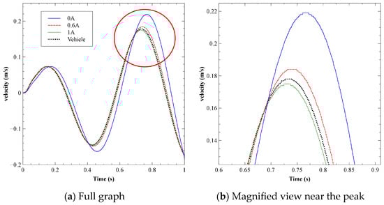 When the added current was 0 A, 0.6 A, and 1 A, the maximum values were 0.118 m/s, 0.123 m/s, and 0.127 m/s, and the time to reach them was 0.5635 s, 0.536 s, and 0.527 s, respectively. For the test vehicle, the maximum value and reaching time were 0.125 m/s and 0.535 s, respectively.