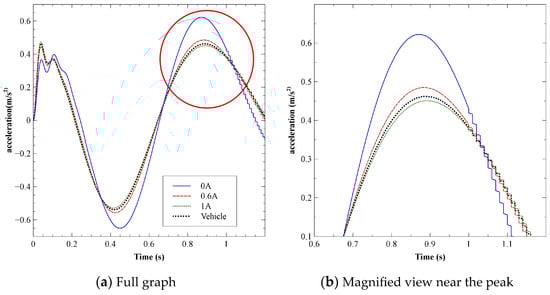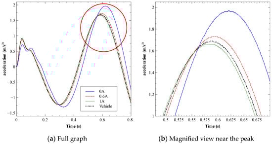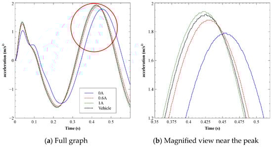 For acceleration, when the added current was 0 A, 0.6 A, and 1 A, the maximum values were 0.622 m/s2, 0.485 m/s2, and 0.451 m/s2, and the time to reach them was 0.871 s, 0.884 s, and 0.892 s, respectively. For the test vehicle, the maximum values and reaching times were 0.462 m/s2 and 0.889 s, respectively.