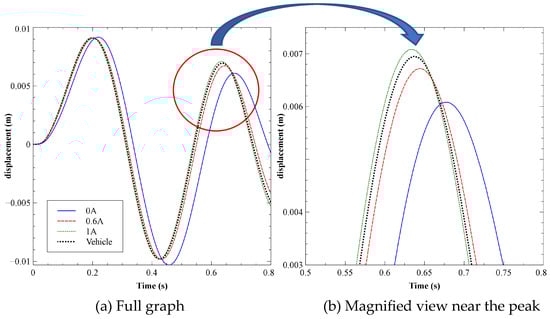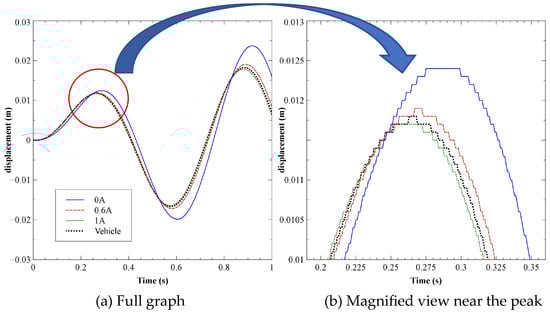 For a displacement of 60 km/h, when the added current was 0 A, 0.6 A, and 1 A, the maximum values were 0.0124 m, 0.0119 m, and 0.0117 m, and the time to reach them was 0.287 s, 0.269 s, and 0.262 s, respectively. For the test vehicle, the maximum values and reaching times were 0.0118 m and 0.265 s, respectively.