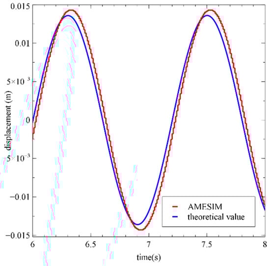 A comparison between calculated by the inverse Laplace transform using Python and the displacement graph obtained from AMESim for periods of 6 to 8 is shown in Figure 37. The error rates of the maximum amplitude and period were 5.23% and 0.01%, respectively, as shown in Table 14. This indicates that the AMESim model used in the numerical analysis is reasonable.