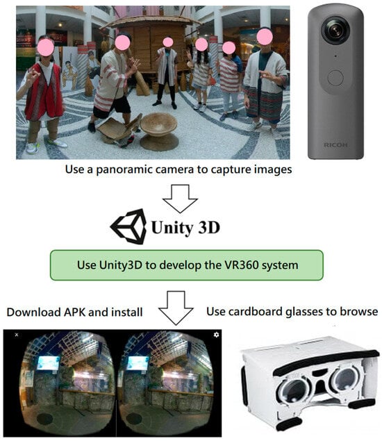 This study utilized the Unity3D 2020, Google VR software development kit (SDK) v1.190.0, and Blender 4.0 3D modeling software as the primary design tools to develop the VR360 ecological system. The required materials of virtual scenes were captured on-site using a RICOH THETA 360 camera. The 360° images were then pasted onto 3D spherical models to create immersive virtual environments for observation points (Figure 3). The C# language was selected in Visual Studio 2022 to develop the interactive programs for triggering events. The images of the user interface were drawn by Adobe photoshop. The development process included the following: (1) designing VR learning content; (2) capturing photos and videos of indigenous tribes and ecological environments; (3) recording voices and editing textual descriptions; (4) developing virtual scenes and a user interface for the ecological environment; (5) exporting the VR360 system as an application for installation on a smartphone with an Android operating system. Figure 4 shows the flowchart to understand the key steps for developing the VR360 APK.