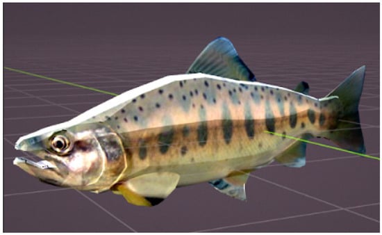 The process of developing a virtual Taiwan Masu Salmon model included (1) creating the 3D fish model, (2) pasting texture images, (3) adding the skeletal system, (4) simulating the motion, and (5) replicating the completed 3D fish model. This study used Blender to create the 3D fish model and used Photo Studio to remove the background image to obtain the texture materials, which were pasted onto the surface of the 3D fish model (Figure 5). When adding the skeletal system, special attention must be paid to setting the functional areas to prevent other parts of the body from deformation. To allow fish models to move and rotate freely within a virtual 3D environment, this study developed movement patterns based on their natural behaviors. A State Transition Diagram was used to analyze the movement characteristics of fish, with the time required for state transitions following a random distribution. Transition probabilities between states were then defined, and a stochastic model was developed to simulate fish movements. Due to the probabilistic nature of this mathematical model, even fish of the same species exhibit unique movement paths. For different species, the model can also simulate distinct movement behaviors by adjusting the transition probabilities between states.