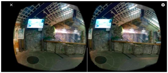 After the completion of the VR360 ecological system, it was exported as an application for installation. Using a smartphone and cardboard glasses, the users can immerse themselves in the virtual scene for learning. Figure 8 and Figure 9 show the stereo view and visual perception of the virtual Taiwan Masu Salmon Ecology Center, respectively. Users can experience a stereoscopic view of the VR360 ecological system within each VR scene. When using cardboard glasses, users can perceive depth through a binocular illusion generated by the stereo image pair. Each VR scene, though resembling the pictures taken by a camera, is displayed as a pair of stereo images. To fully experience the 3D visual effect, users need to wear cardboard glasses to activate this stereo perception. Cardboard glasses have the advantages of portability, easy operation, lower expense, and the ability to display 360° panoramic images. Within the virtual environment, users can conduct observations from different viewing angles or focus on an icon to trigger the event like showing detailed information, scene transitions, and playing audio or video.