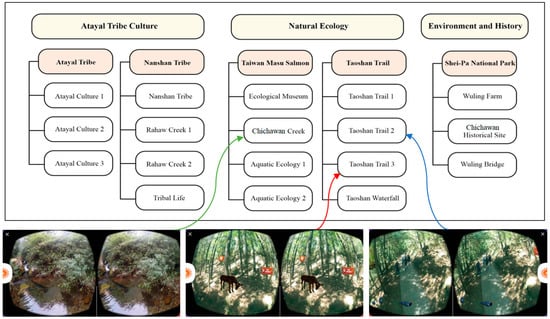 Figure 10 displays the architecture diagram of the VR360 ecological system, which includes virtual scenes such as Chichawan Creek (showing the Taiwan Masu Salmon), Taoshan Trail 2 (showing Swinhoe’s Pheasant), and Taoshan Trail 3 (showing the Formosan Reeve’s Muntjac), as can be seen in the figure. After entering a VR360 scene, the user can explore the environment following tasks outlined in the learning worksheet. The virtual scene includes road signs guiding users to other areas, icons providing information about local species, and functions offering content on the ecological environment. Users are encouraged to freely explore indigenous culture, observe relevant ecological information, and complete the tasks assigned in their worksheets.