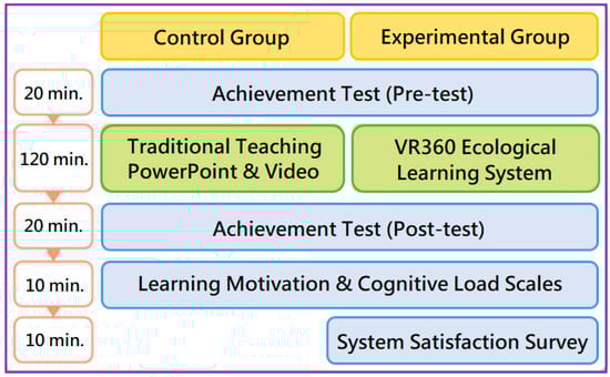 This study employed a quasi-experimental design by dividing participants into experimental and control groups. The experimental group used the VR360 ecological system for learning, while the control group received instruction through the traditional teaching method (using PowerPoint and video teaching materials). There are 23 VR modules in the VR360 ecological system and it takes about 5 min to view each VR module. The total instruction took two hours for both groups to complete the learning activity. Both groups completed pre-tests and post-tests to evaluate the impact of different teaching methods on their learning outcomes (20 min for each test). They filled out the learning motivation and cognitive load scales after the instruction (5 min for each scale). In addition, the experimental group had to complete a system satisfaction questionnaire (10 min) to gain insights into their learning experiences and provide feedback on the VR360 ecological system. The total teaching experiment took about 3 h. The flowchart of the teaching experiment is shown in Figure 11.