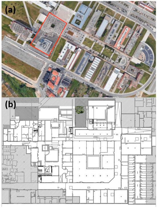 University of Aveiro Campus. (a) The red line highlights the Central Technical Area and (b) the plant of the Central Technical Area.