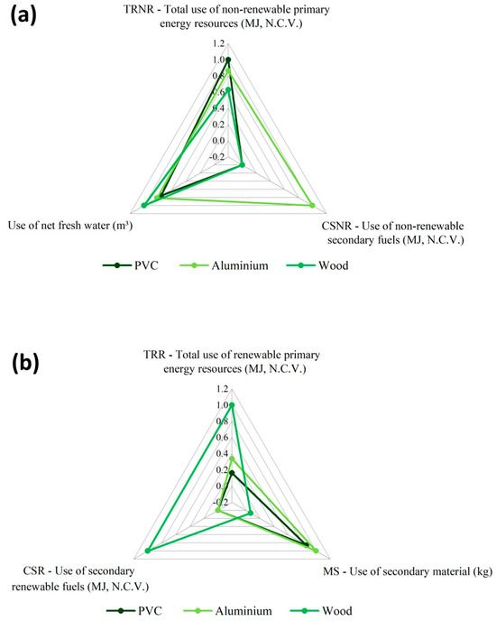 Normalized resource consumption of different window frame materials’ (a) consumption of non-renewable resources and (b) consumption of renewable resources.