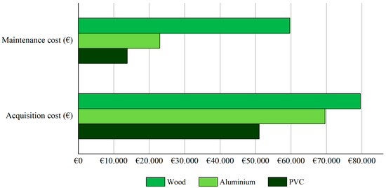 A graphic representation of the cost structure is generated by the tool for easy interpretation, as shown in Figure 4. The results of the case study under analysis show that PVC window frames present the lowest acquisition cost (EUR 51,016.74) and maintenance cost (EUR 13,775.94), representing an average total cost per year of EUR 2159.76 over the 30-year service life. Wooden window frames were found the least economically attractive option, with the highest acquisition (EUR 79,554.87) and maintenance costs (EUR 59,664.18), representing an average annual investment of EUR 4640.64. The economic results contrast with the environmental analysis, where wooden window frames were found to be the best-performing solution in the majority of the environmental indicators analyzed.