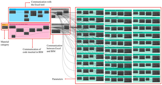 The communication or articulation of the eco-design tool output with BIM was engineered through a visual programming software application (Dynamo) of the BIM family. A routine was created to import information consisting of interconnections between pre-defined nodes existing in the software, represented by black boxes in Figure 5. Each node has connections, represented by lines, that allow data to be transferred. The nodes are divided either as “inputs” and “outputs”, and the connection can only be established if the data are comparable. In Figure 5, five groups of nodes are represented by color, and each group is responsible for different tasks: (i) blue group: communication with the Excel tool; (ii) orange group: material category in BIM; (iii) pink group: communication of the code entered into the BIM; (iv) grey group: the values to be searched in Excel and BIM; and (v) green group: parameters to be filled in the BIM.