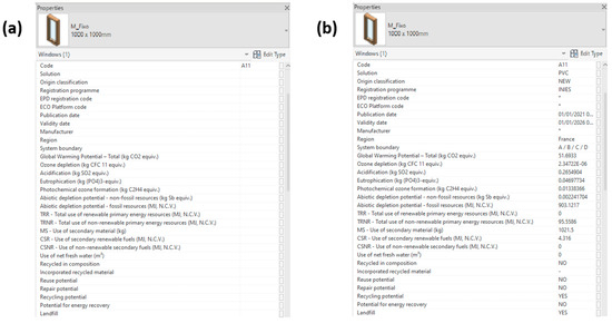 To validate the communication between the eco-design tool and the BIM, PVC window frames were selected, as they demonstrated the best overall performance. In the present case-study, the “Windows” category and the “A11” code were selected, as pre-defined earlier. The routine created in Dynamo was executed and the data imported automatically (Figure 6b). The routine developed in Dynamo allowed effective communication between the eco-design tool and BIM, enabling environmental data storage in BIM models associated with the case study under analysis. It should be mentioned that the data entered are not intended for calculations but rather for future memory, facilitating access to the information throughout the building’s life cycle. This data storage method can also be useful in design maintenance, rehabilitation, and demolition actions and serve as a reference point given the continuous evolution of standards, materials, and EPDs.