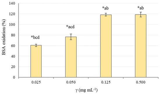 Protein oxidation rate of bovine serum albumin (BSA) protein treated with Mountain Germander extract concentrations (0.025–0.500 mg mL−1). Statistical data processing was carried out by one-way analysis of variance with Tukey’s post hoc test. * = statistically significantly different (p < 0.05) compared to the negative control (water); a = statistically significantly different (p < 0.05) compared to 0.025 mg mL−1; b = statistically significantly different (p < 0.05) compared to 0.050 mg mL−1; c = statistically significantly different (p < 0.05) compared to 0.150 mg mL−1; d = statistically significantly different (p < 0.05) compared to 0.500 mg mL−1.