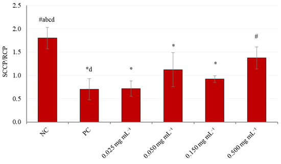 The effect of Mountain Germander extract concentrations (0.025–0.500 mg mL−1) on DNA plasmid oxidative damage. SCCP/RCP = ratio of supercoiled and relaxed circular plasmid; NC = sum of all tested negative control; PC = positive control (plasmid + H2O2 + UV radiation). Statistical data processing was carried out by one-way analysis of variance with Tukey’s post hoc test. # = statistically significantly different (p < 0.05) compared to the positive control; * = statistically significantly different (p < 0.05) compared to the negative control; a = statistically significantly different (p < 0.05) compared to 0.025 mg mL−1; b = statistically significantly different (p < 0.05) compared to 0.050 mg mL−1; c = statistically significantly different (p < 0.05) compared to 0.150 mg mL−1; d = statistically significantly different (p < 0.05) compared to 0.500 mg mL−1.
