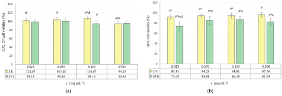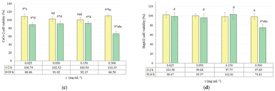 Cell viability of tested lines: (a) CAL 27; (b) AGS; (c) Caco-2; and (d) HepG2 after 2 and 24 h of treatment with Mountain Germander extract concentrations (0.025–0.500 mg mL−1). One-way analysis of variance was carried out between the tested concentrations with Tukey’s post hoc test. The values marked with the sign # are statistically significantly (p < 0.05) different in regard to the treatment time for each extract concentration, and were obtained by performing the Mann–Whitney test (p < 0.05). * = statistically significantly different (p < 0.05) compared to negative control (water); a = statistically significantly different (p < 0.05) compared to 0.025 mg mL−1; b = statistically significantly different (p < 0.05) compared to 0.050 mg mL−1; c = statistically significantly different (p < 0.05) compared to 0.150 mg mL−1; d = statistically significantly different (p < 0.05) compared to 0.500 mg mL−1.