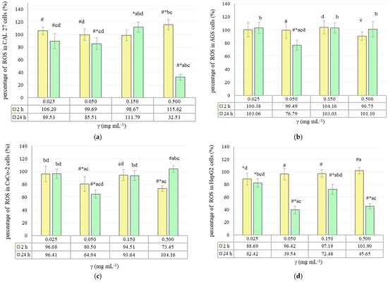 Induction of free radicals (ROS) on cell lines: (a) CAL 27; (b) AGS; (c) Caco-2; and (d) HepG2 after 2 and 24 h of treatment with Mountain Germander extract concentrations (0.025–0.500 mg mL−1). One-way analysis of variance was carried out between the tested concentrations with Tukey’s post hoc test. The values marked with the sign # are statistically significantly (p < 0.05) different in regard to the treatment time for each extract concentration, and were obtained by performing the Mann–Whitney test (p < 0.05). * = statistically significantly different (p < 0.05) compared to negative control (water); a = statistically significantly different (p < 0.05) compared to 0.025 mg mL−1; b = statistically significantly different (p < 0.05) compared to 0.050 mg mL−1; c = statistically significantly different (p < 0.05) compared to 0.150 mg mL−1; d = statistically significantly different (p < 0.05) compared to 0.500 mg mL−1.