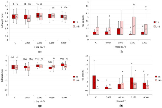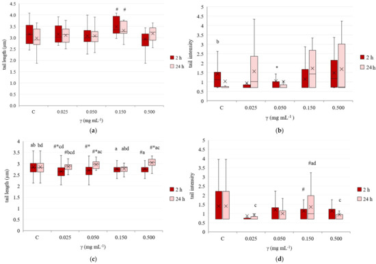 The effect of Mountain Germander extract concentrations (0.025–0.500 mg mL−1) on DNA tail length and tail intensity of the cell lines: (a,b) CAL 27; (c,d) AGS; (e,f) Caco-2; and (g,h) HepG2 cells after 2 and 24 h of treatment. One-way analysis of variance was carried out between the tested concentrations with Tukey’s post hoc test. The values marked with the sign # are statistically significantly (p < 0.05) different in regard to the treatment time for each extract concentration, and were obtained by performing the Mann–Whitney test (p < 0.05). * = statistically significantly different (p < 0.05) compared to negative control (culture medium); a = statistically significantly different (p < 0.05) compared to 0.025 mg mL−1; b = significantly different (p < 0.05) compared to 0.050 mg mL−1; c = statistically significantly different (p < 0.05) compared to 0.150 mg mL−1; d = statistically significantly different (p < 0.05) compared to 0.500 mg mL−1.