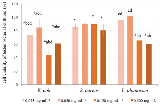 Cell viability of tested bacterial strains treated with Mountain Germander extract concentrations (0.025–0.500 mg mL−1). One-way analysis of variance was carried out with Tukey’s post hoc test. * = statistically significantly different (p < 0.05) compared to negative control (PBS buffer); a = statistically significantly different (p < 0.05) compared to 0.025 mg mL−1; b = significantly different (p < 0.05) compared to 0.050 mg mL−1; c = statistically significantly different (p < 0.05) compared to 0.150 mg mL−1; d = statistically significantly different (p < 0.05) compared to 0.500 mg mL−1.