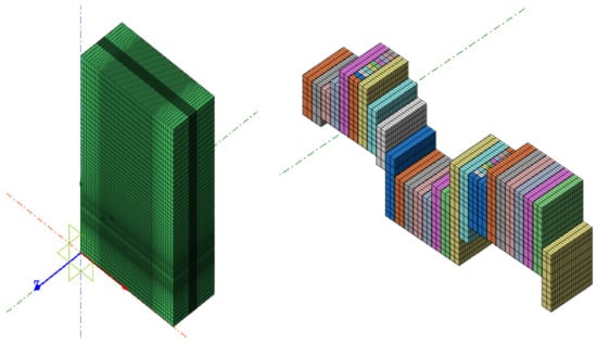 This study uses the 61 line profile as a reference to establish a stope model that closely matches the actual conditions of the mining area. The dimensions of the model are X × Y × Z = 900 m × 400 m × 1000 m, with the length of the stope model set at 80 m, the width at 18 m, and the height determined based on the thickness of the ore body. Since Midas GTS employs finite element technology for mesh generation, the node and element divisions are consistent with those in FLAC3D. The conversion program MidastoFlac3D.exe facilitates the transformation of the GTS mesh model into a numerical model for FLAC3D. The final numerical model of the surrounding rock of the ore body and the ore body model for the 60 line stope are illustrated in Figure 1.