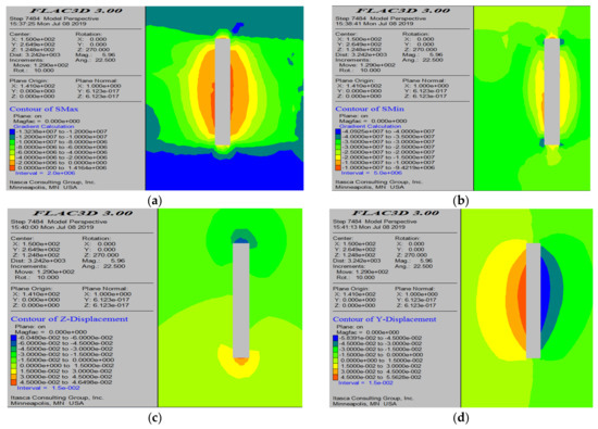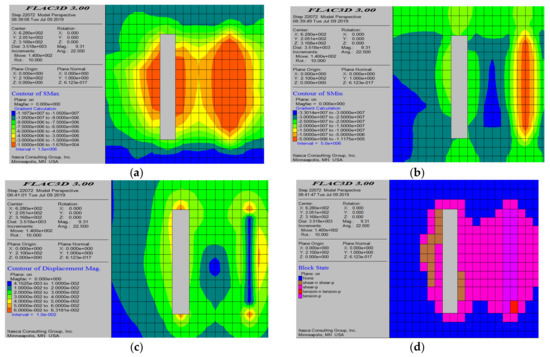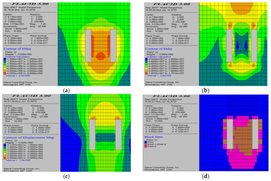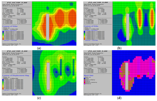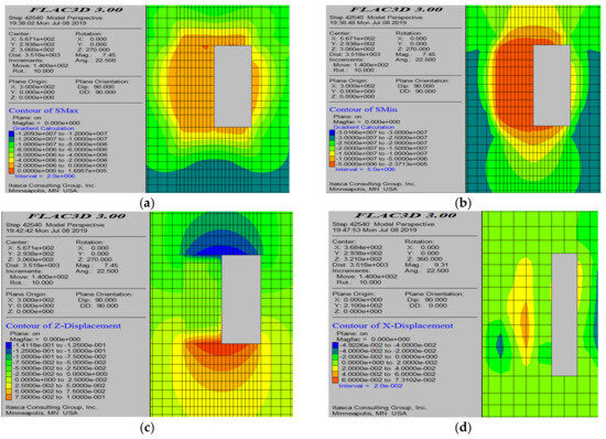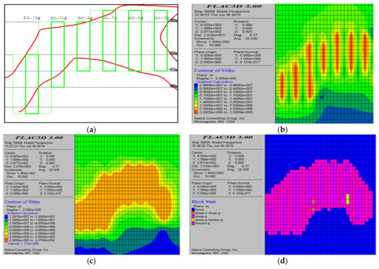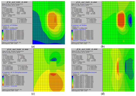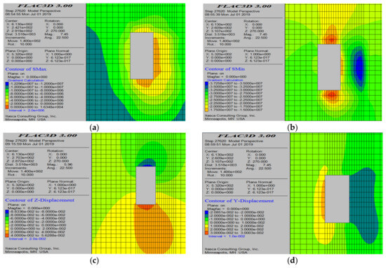 Numerical simulation results after the completion of all mining operations. (a) Maximum principal stress contour map; (b) minimum principal stress contour map; (c) displacement cloud diagram; and (d) plastic zone distribution.