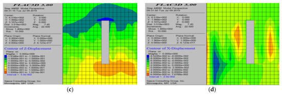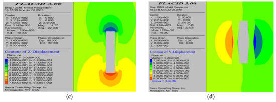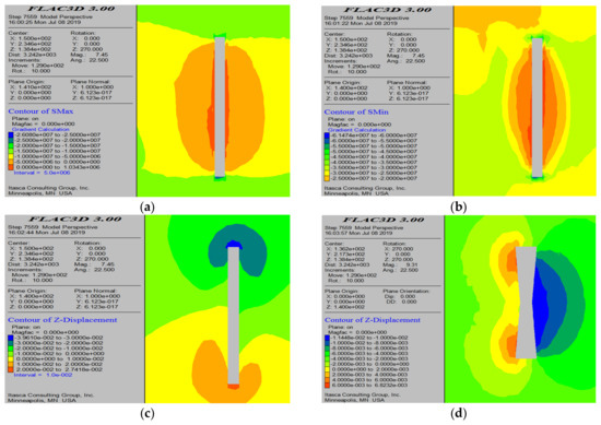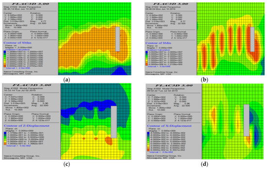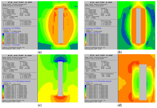 Simulation results with 4 m thick pillars left on both sides of the mining area. (a) Maximum principal stress cloud map; (b) minimum principal stress cloud map; (c) displacement cloud map of the roof; and (d) displacement cloud map of the pillars.