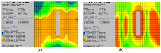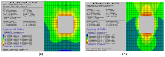From Figure 24 and Figure 25, the maximum principal stress cloud diagram indicates that, during the process of mining from the center towards both sides, both sides of the empty area experience tensile stress within a certain range. However, the tensile stress is relatively small, and its range is limited. As the mining progresses, the position of the tensile stress gradually changes, and, upon nearing the completion of the mining, the roof of the empty area experiences some tensile stress, albeit at a low level. The minimum principal stress cloud diagram shows that the maximum compressive stress is primarily located at the bottom of both sides of the mining area and at the intersection with the cross-cut tunnel. The maximum compressive stress also varies continuously as the mining advances.