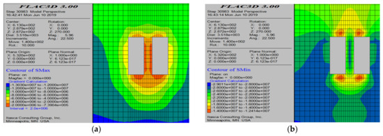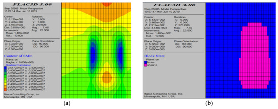 Simulation results before the extraction of the 60-10# working face. (a) Minimum principal stress cloud map; and (b) plastic zone cloud map.