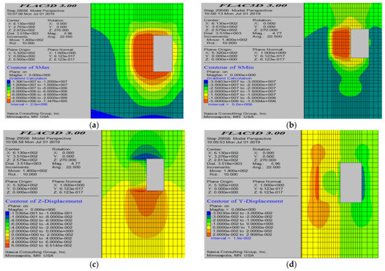 Simulation results after the extraction of the 60-3# working face. (a) Maximum principal stress contour map; (b) minimum principal stress contour map; (c) roof displacement contour map; and (d) displacement contour map on both sides.