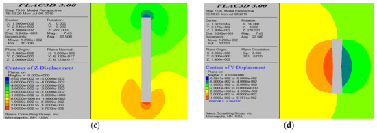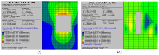 Figure 22 shows the simulation results after completing the two-step mining according to the original mining method, mainly for comparison with this scheme. From the simulation results, it can be seen that only a small portion of the fill material on both sides of the void is affected by tensile stress after mining, with a maximum tensile stress of 1.47 MPa, which may lead to some falling of the fill material. From the minimum principal stress cloud map (Figure 22b), it can be observed that there is no stress concentration around the void, and the maximum compressive stress is located in the surrounding areas of the one-step and two-step mining after extraction, which has little impact on the void. The maximum displacement of the roof is 13.6 cm, while the maximum displacement of the fill material on both sides of the void is 5.2 cm.