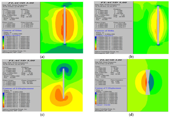 Numerical simulation results of stope 23# stope with first half stope. (a) Maximum principal stress cloud map; (b) minimum principal stress cloud map; (c) profile cloud diagram along the mining area direction; and (d) profile cloud diagram perpendicular to the mining area direction.