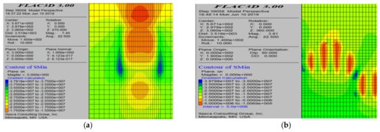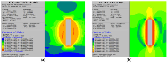 Minimum principal stress cloud diagram before the mining of the 60-23# mining area. (a) Profile cloud diagram along the mining area direction; and (b) profile cloud diagram perpendicular to the mining area direction.