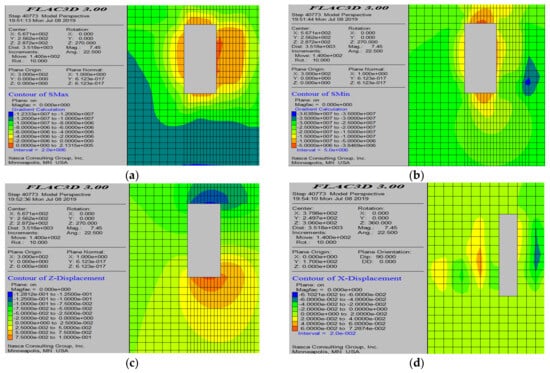 Simulation results after the mining of the 60-8# working face. (a) Maximum principal stress contour map; (b) minimum principal stress contour map; (c) displacement contour map; and (d) plastic zone contour map.