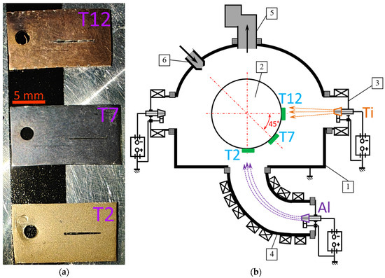 General view of samples with deposited coatings (scratch test grooves are visible) (a) and general setup diagram and sample arrangement (b): 1—chamber; 2—rotary table (not rotated during coating deposition); 3—Controlled Accelerated Arc (CAA-PVD) system evaporator (with titanium cathode); 4—filtered cathodic vacuum arc deposition (FCVAD) system evaporator (with aluminum cathode); 5—vacuum system; 6—gas leak.